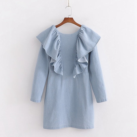 Tangada fashion women blue denim jeans dress ruffles backless long sleeve ladies vintage short dress vestidos 1D30